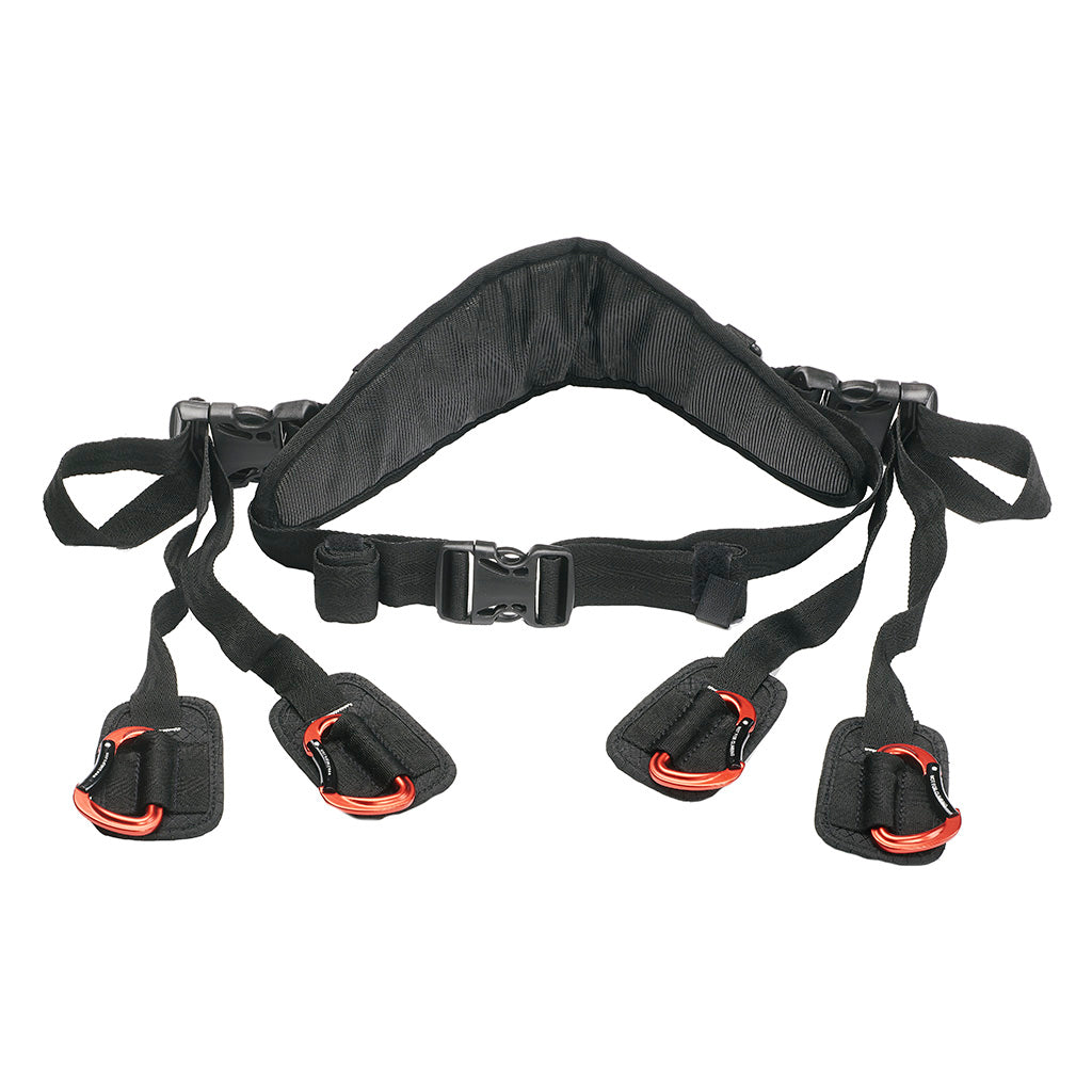 - Un solo lazo de correa permite apretar y aflojar rápidamente ambos mosquetones en un movimiento rápido, al mismo tiempo que permite un ajuste individual.