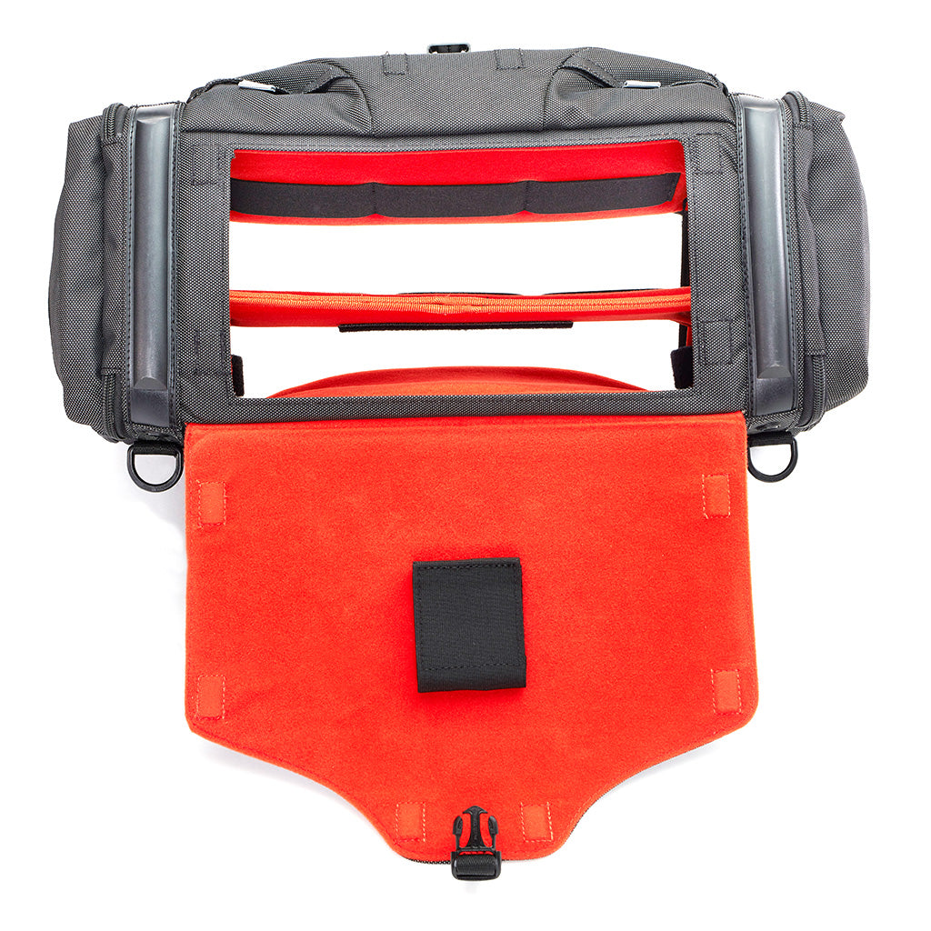 Diversos puntos de paso de cables y prácticos compartimentos demuestran la versatilidad de la bolsa Stingray Small para adaptarse a diferentes equipos y entornos de grabación.