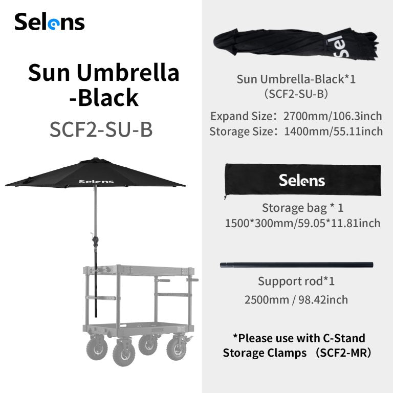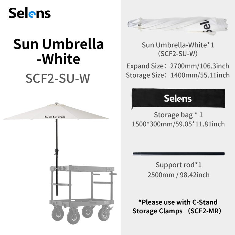 Esta sombrilla de Selens ayuda a mantener su equipo fresco bajo la luz solar intensa. Tiene un diámetro de 82,67" (casi 7 pies) cuando está abierta. Incluye una varilla de soporte de 41,33", que permite montarla en diversos soportes, como soportes de iluminación resistentes o carros para equipos. Para el montaje se requieren cuatro abrazaderas superfuertes (disponibles por separado) para asegurar la sombrilla de forma segura.